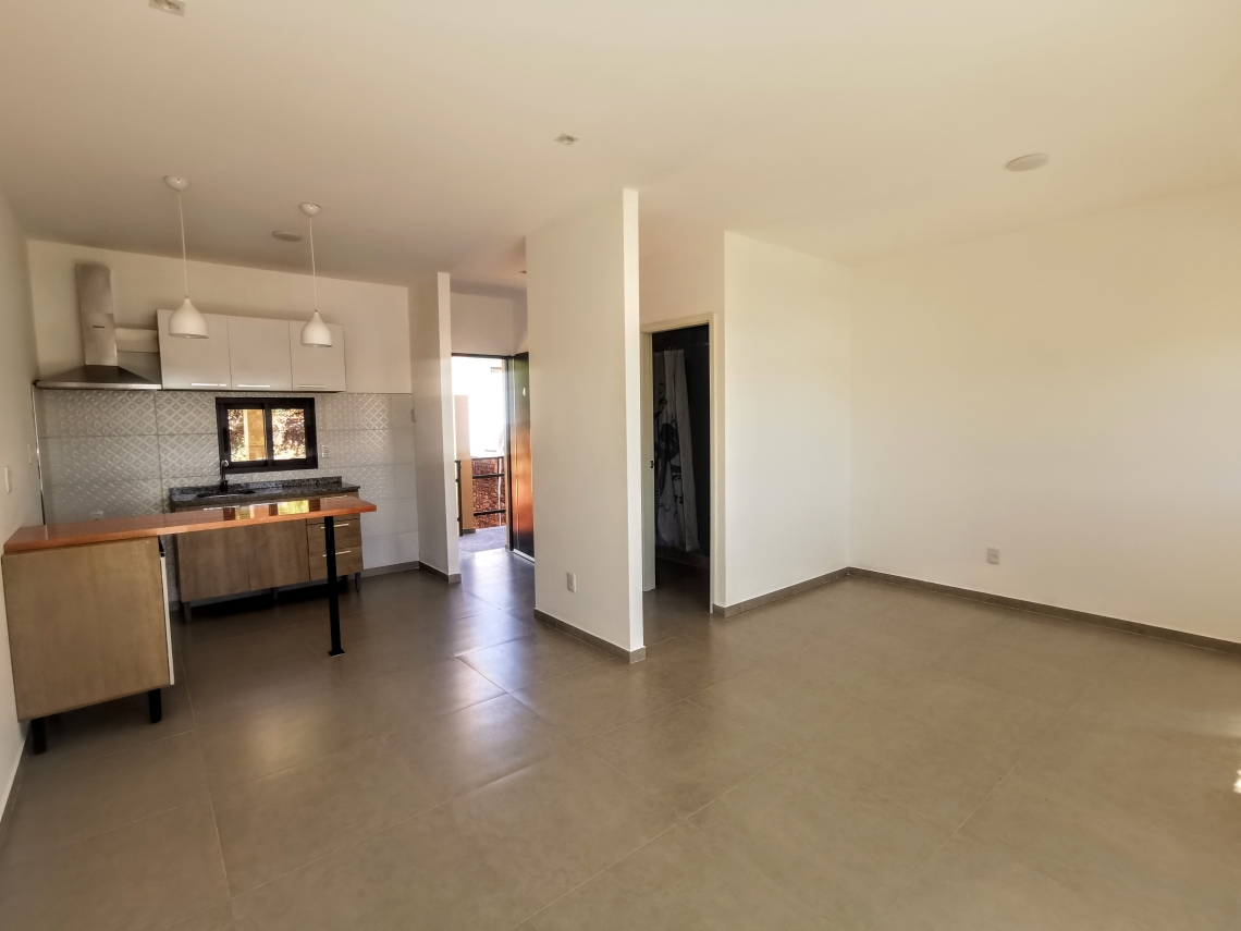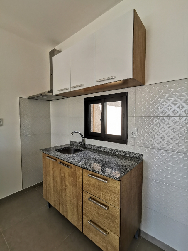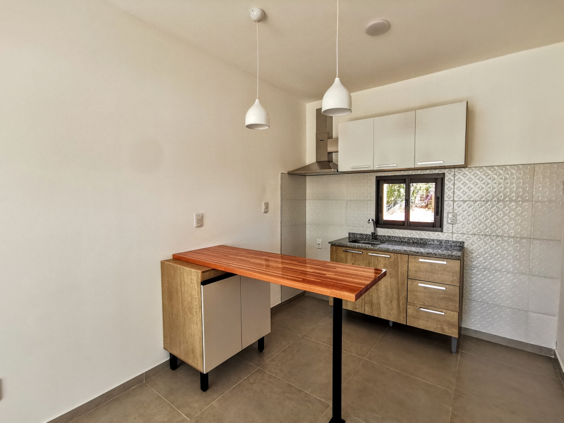 - Kitchenette equipada con desayunador, muebles aéreos y bajo mesada