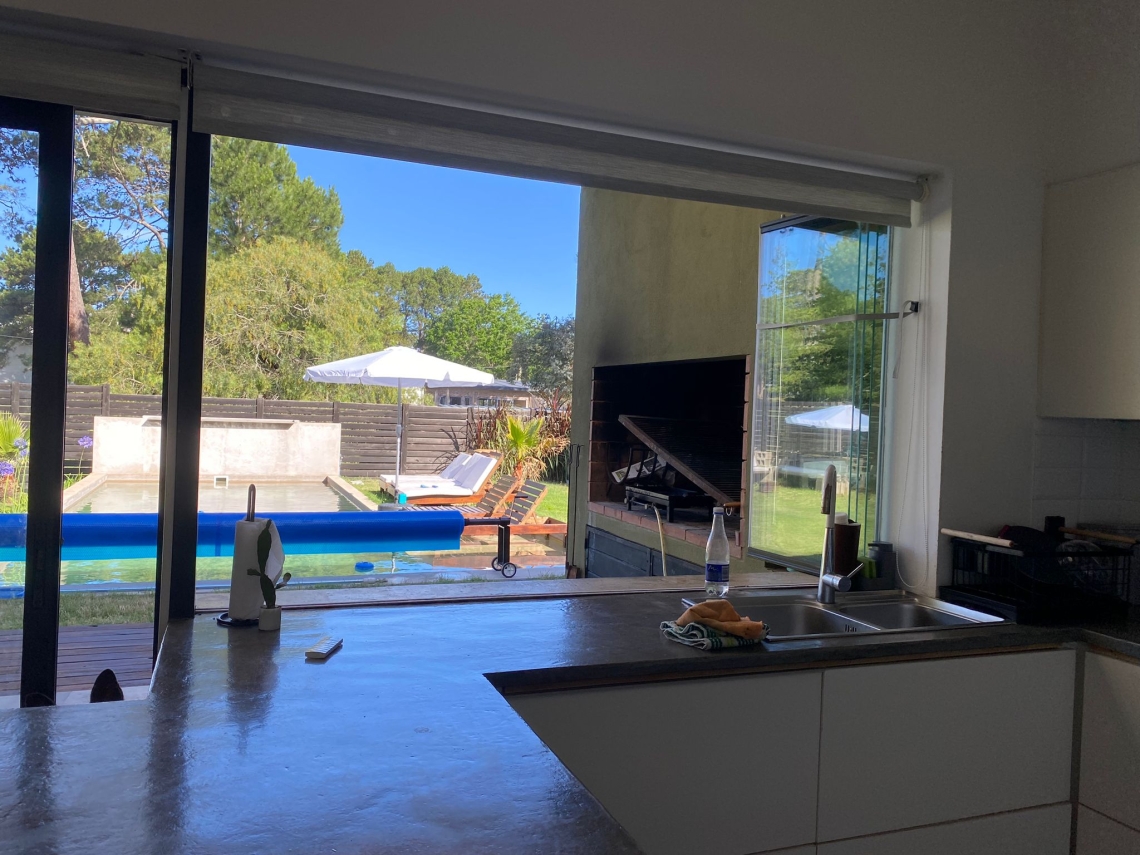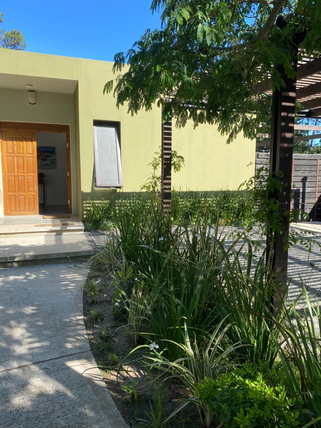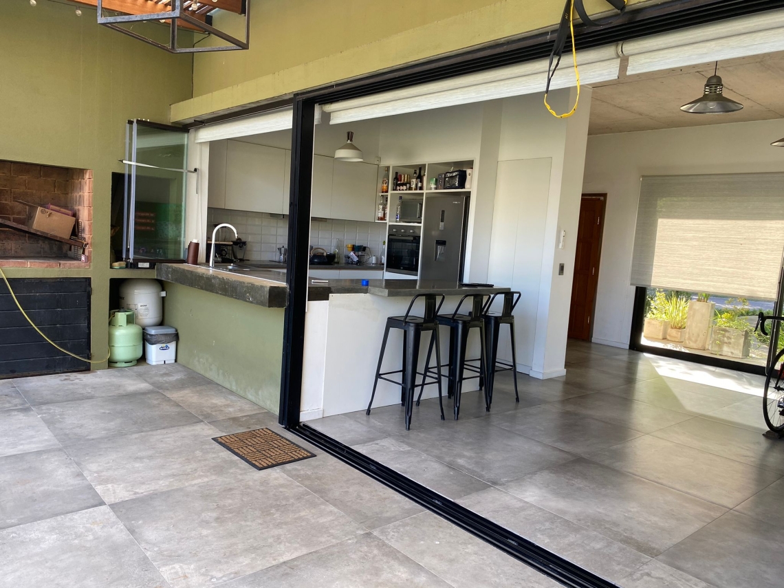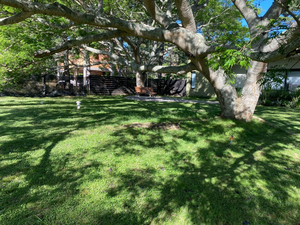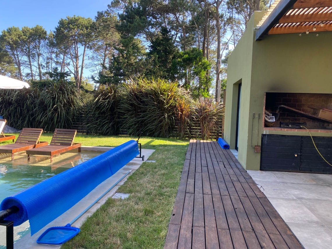 El deck con parrillero es perfecto para organizar reuniones y disfrutar de asados al aire libre. El extenso jardín, rodeado de césped y plantas, proporciona un entorno natural y relajante que completa esta maravillosa propiedad.