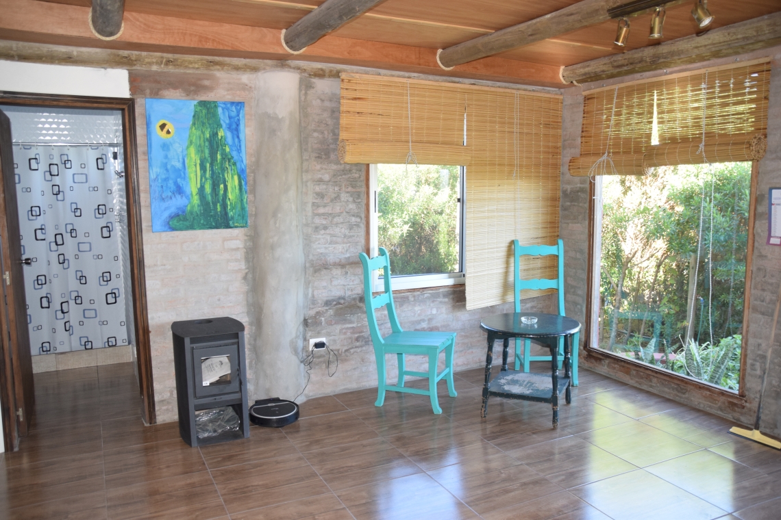 La propiedad ofrece dos estructuras principales: una sofisticada residencia principal con un diseño de concepto abierto que integra de manera armoniosa la sala de estar, el comedor y la cocina. Además, cuenta con un dormitorio principal completo con baño privado, y un baño adicional para visitantes. Un amplio alero se extiende a lo largo del frente de la casa, equipado con un área de parrilla techada y espacio para dos vehículos en la cochera. También incluye un galpón de generosas dimensiones.