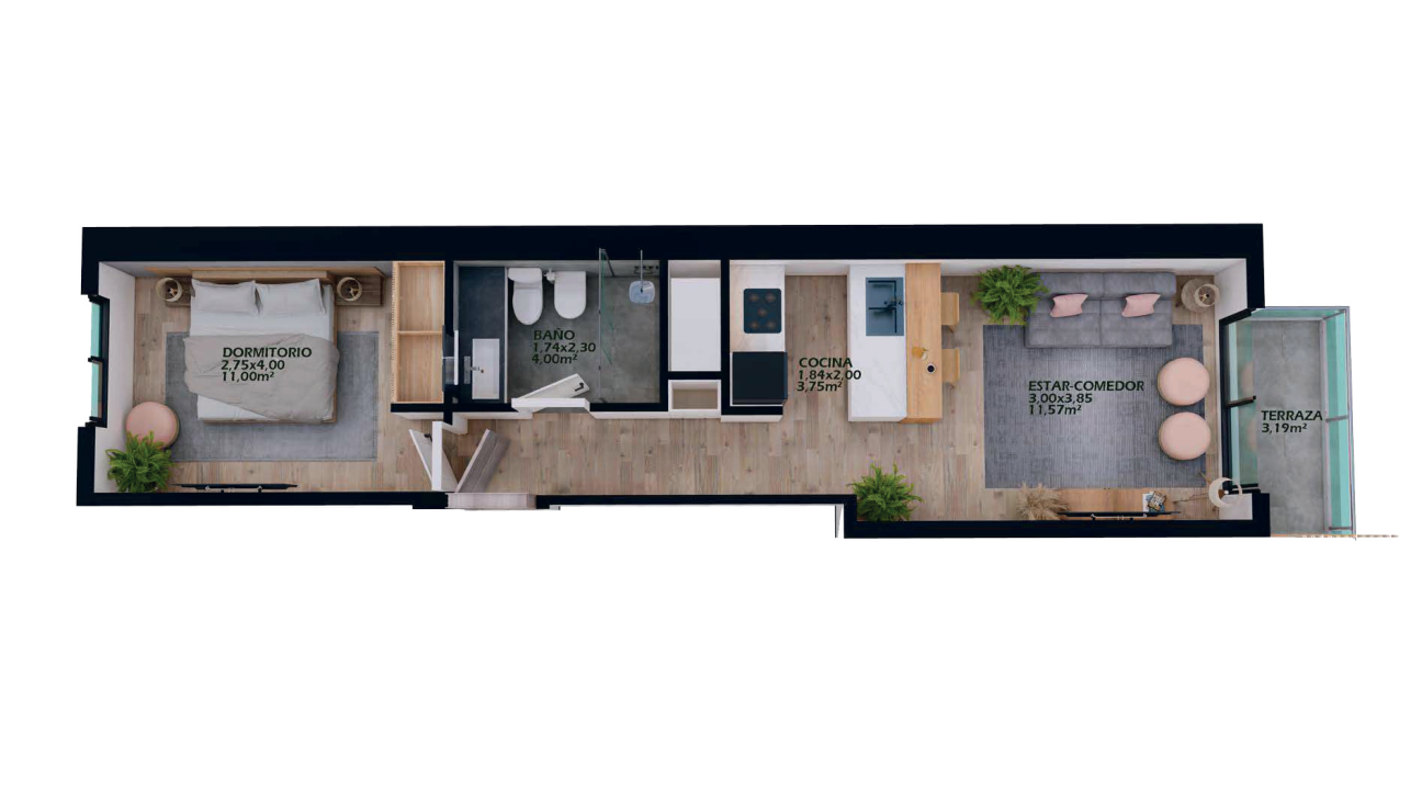 - Apartamentos de 1 dormitorio: estar-comedor, cocina integrada, baño y terraza.