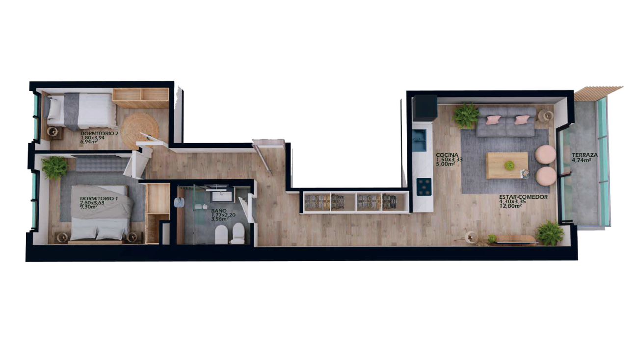 - Apartamentos de 2 dormitorios: living-comedor, cocina integrada, baño y terraza.