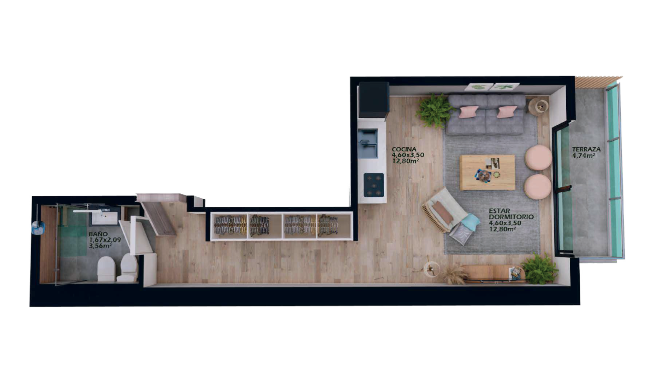 - Monoambientes: con cocina integrada, baño completo y terraza.